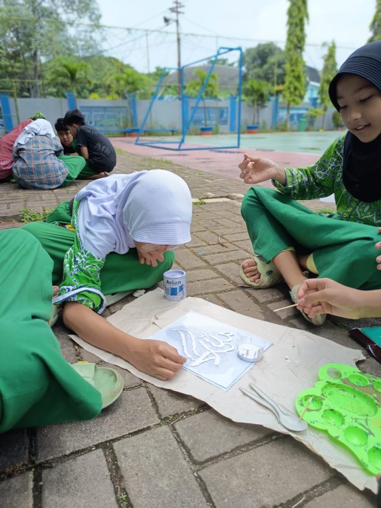 Suasana kelas dipenuhi oleh antusiasme yang fokus. Seluruh siswa kelas 6 dibagi menjadi beberapa kelompok kecil. Di setiap meja, peralatan telah siap: lembaran kaca transparan sebagai kanvas utama, cat kaca kaca/cat besi dalam berbagai pilihan warna, tusuk gigi sebagai kuas dengan ujung yang beragam, serta sketsa desain kaligrafi sederhana sebagai panduan.